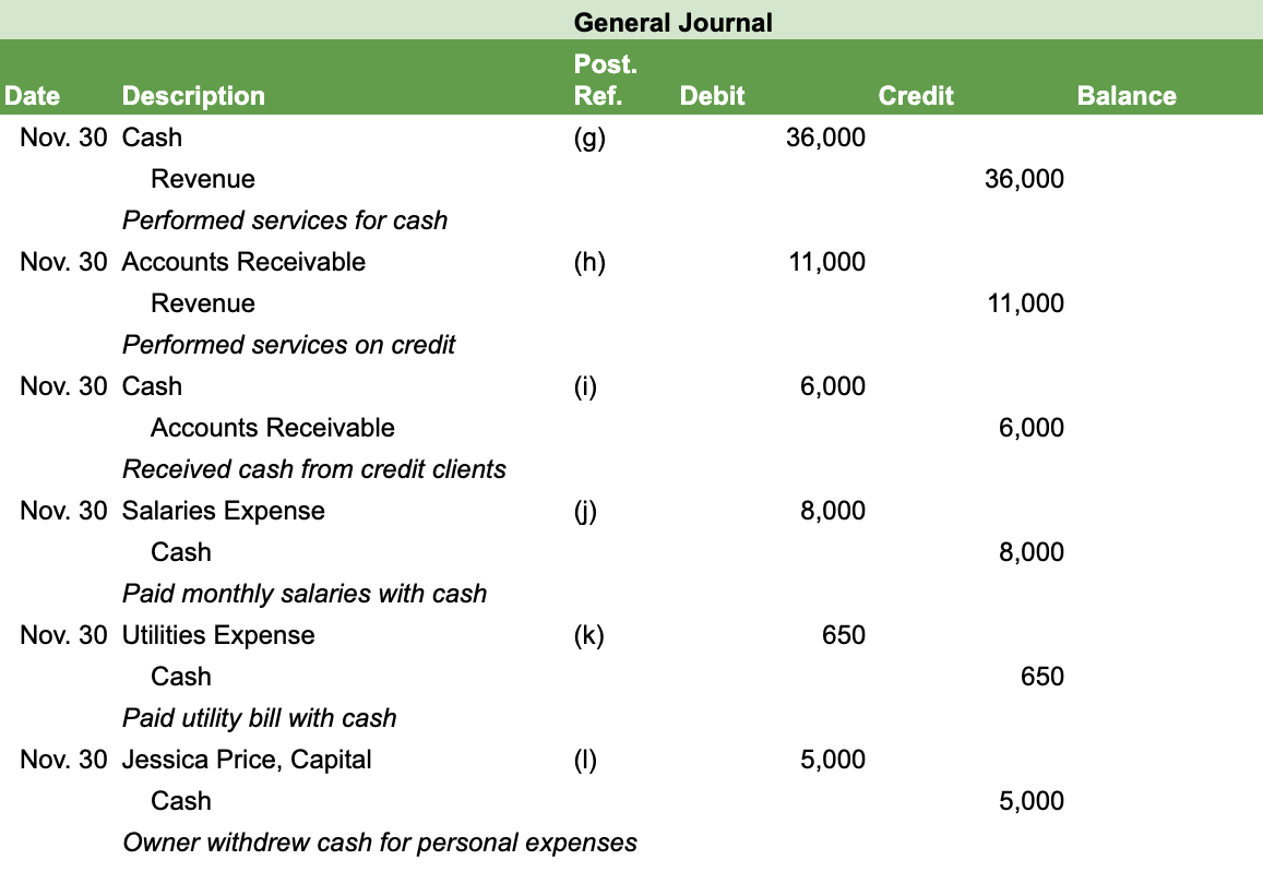 Jessica’s Consulting Services began operations on November 1. Below is a summary of the revenue, expense, and withdrawal transactions that occurred during the month of November.