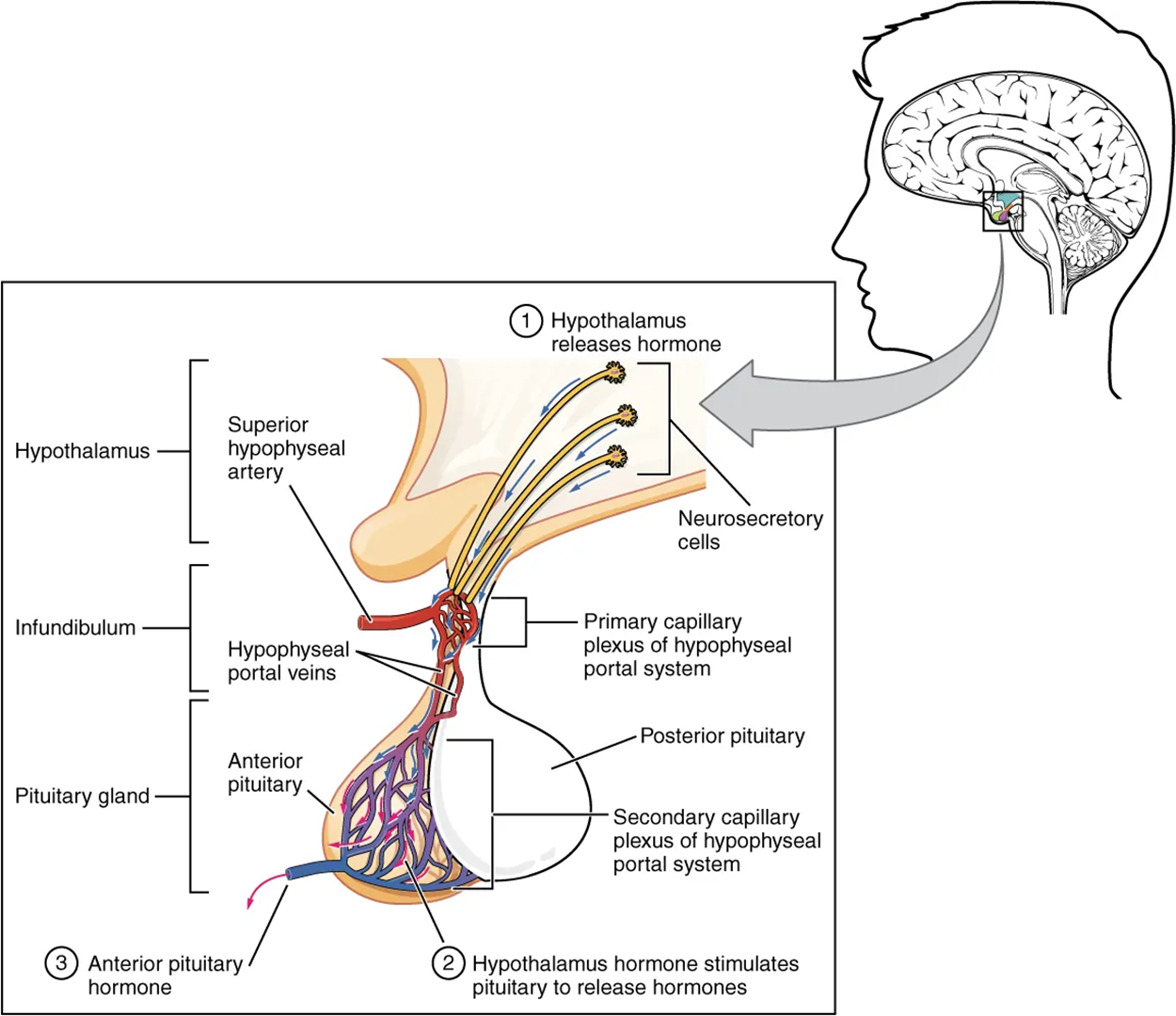 Hypothalamic hormones are secreted by neurons, but they enter the anterior pituitary through blood vessels. Within the infundibulum is a bridge of capillaries that connects the hypothalamus to the anterior pituitary. This network, called the hypophyseal portal system, allows hypothalamic hormones to be transported to the anterior pituitary without first entering the systemic circulation. This system originates from the superior hypophyseal artery, which branches off the carotid arteries and transports blood to the hypothalamus. The branches of the superior hypophyseal artery form the hypophyseal portal system.