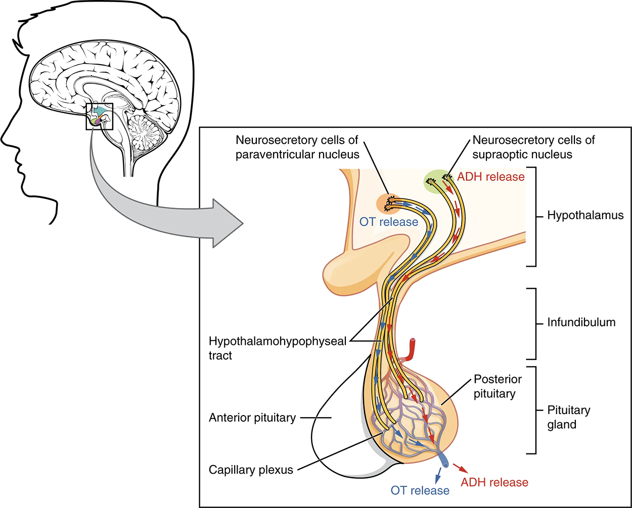 The posterior pituitary is actually an extension of the neurons of the paraventricular and supraoptic nuclei of the hypothalamus. The cell bodies of these regions rest in the hypothalamus, but their axons descend as the hypothalamic–hypophyseal tract within the infundibulum and end in axon terminals that comprise the posterior pituitary.