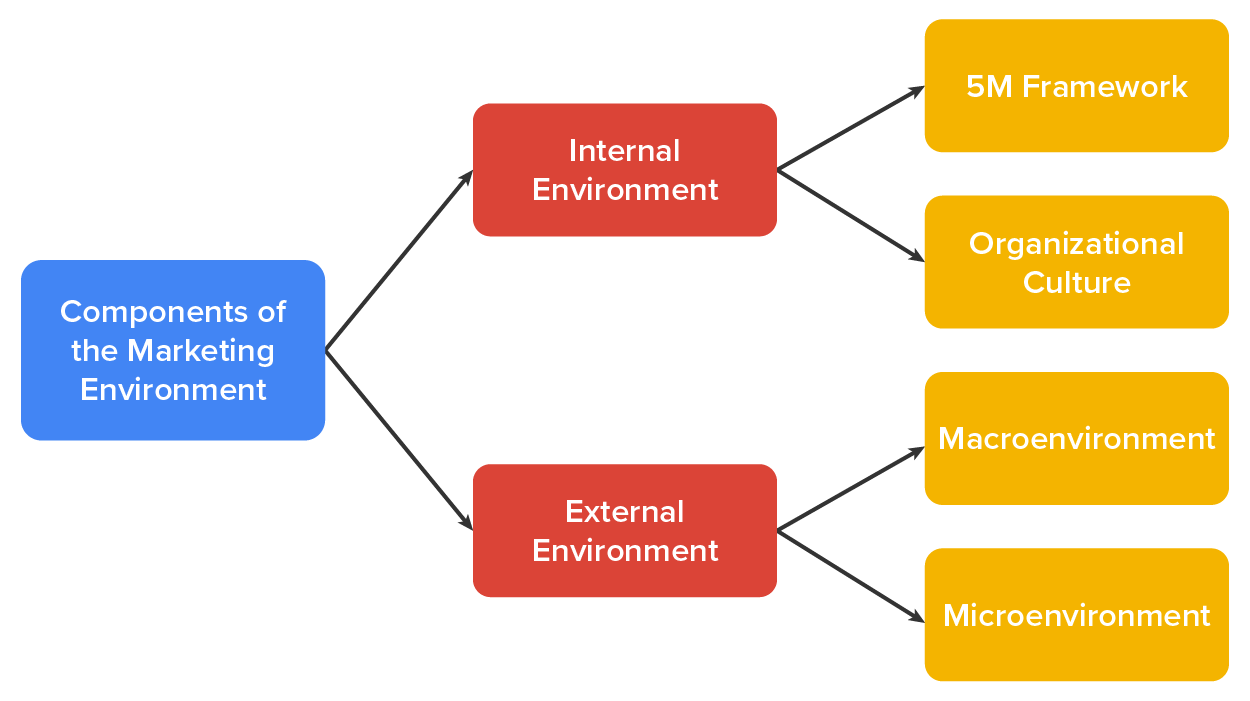 Marketers are affected by factors in their internal or organizational environment. These factors are typically within the company’s control and can be improved with strategic focus. The 5M Framework identifies the areas in which decisions are made to improve the marketing environment: minds (organizational talent), minutes (methods or processes), machinery (equipment necessary for the business), materials (requirements for the end product), and money (financial resources). An additional factor is organizational culture, which represents the values, behaviors, processes, and traditions that make the company effective.