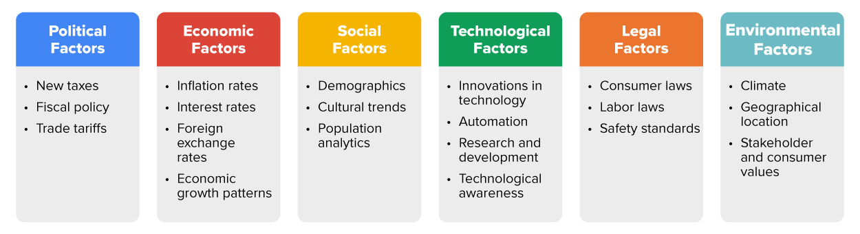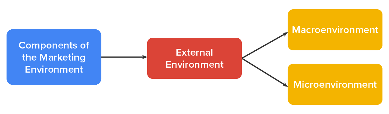 Marketers also face external environmental factors that can support or challenge their decisions. Two groups of factors in this category are microenvironment (consists of stakeholders outside of the company) and macroenvironment (global) factors. Marketers have significantly less control over these factors than over internal factors, which requires constant research to anticipate changes in the external environment.