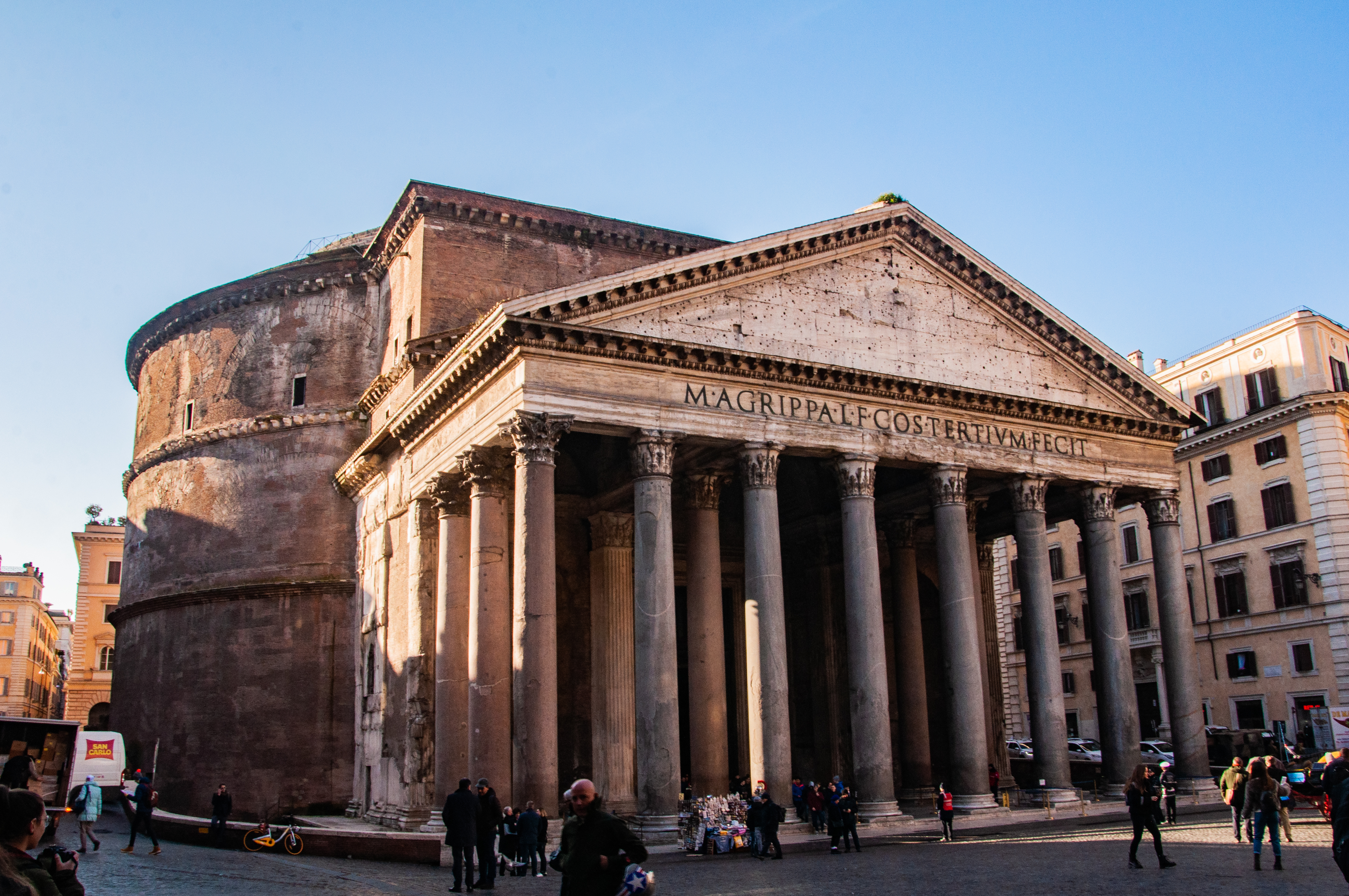 Over the front entrance is an inscription dedicated by the emperor Hadrian to Marcus Agrippa, who was the man responsible for the construction of another Roman temple, the Maison Carrée in present-day France.