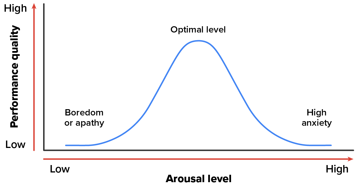 According to the Yerkes–Dodson law, we all have an optimal level of arousal (stress). If we are under-aroused, we may become bored and seek out something stimulating. If we are over-aroused, our function and performance may suffer as stress becomes excessive and debilitating. Research shows that moderate arousal is generally best. When stress levels reach the highest point of the curve, a person is at their peak performance—feeling energized, focused, and working with maximum efficiency. As seen in the graph below, the Yerkes–Dodson law illustrates this through a bell-shaped curve, and because of this, it is sometimes also called the “inverted-U theory”. Performance increases with arousal (stress) but only up to a certain point. When levels of arousal (stress) become too high, performance decreases.