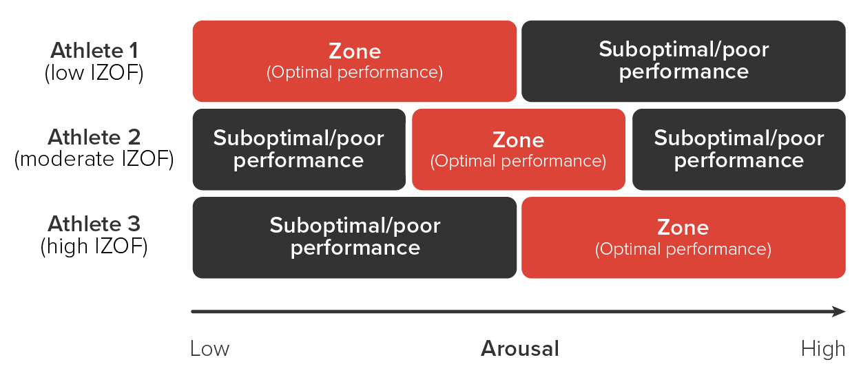 Initial research in IZOF was done on top-level athletes across all kinds of sports by psychologist Juri Hanin, creator of the IZOF theory. In the graphic below, you can see an example of three different athletes based on their IZOF. Athlete 1 with low IZOF performs best with low arousal levels. Athlete 2 with moderate IZOF performs best with moderate arousal levels. Athlete 3 requires moderate to high arousal levels to perform at their best. Interestingly, Hanin found that many top athletes not only performed well with relatively high amounts of stress and anxiety but that they needed those high levels to perform at their best (Ruiz et al., 2017).