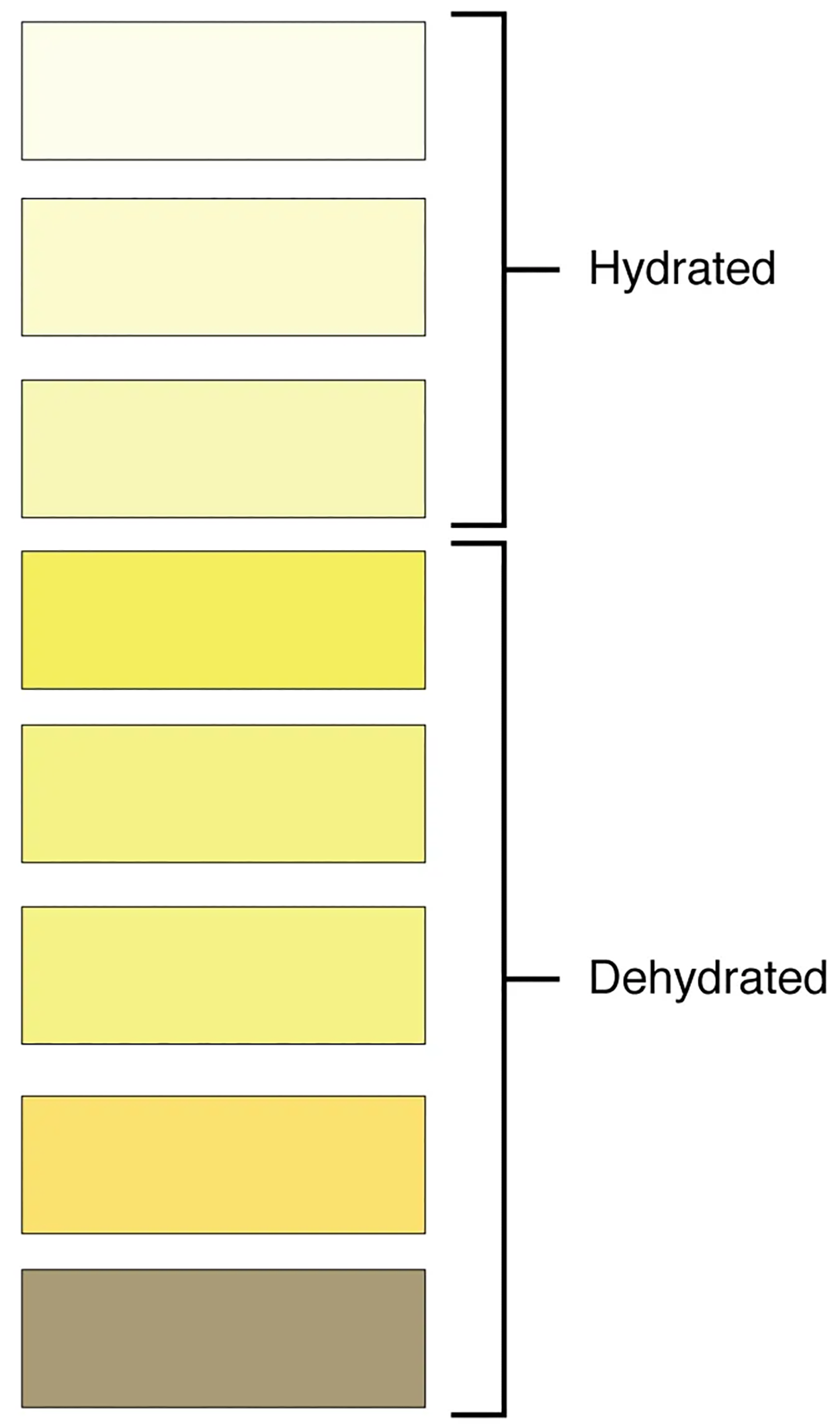 Characteristics of the urine you excrete change depending on influences such as water intake, exercise, environmental temperature, nutrient intake, and other factors (see the table below). Some of the characteristics such as color and odor are rough descriptors of the state of hydration (whether you are hydrated or dehydrated).