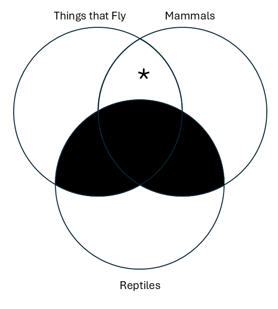 Note that if any intersection of two categories is shaded, the center must also be shaded. Because if something isn’t B and C, then it’s definitely not B, C, and A. If nothing is a reptile and a mammal, it can’t also be a flying reptile and mammal.