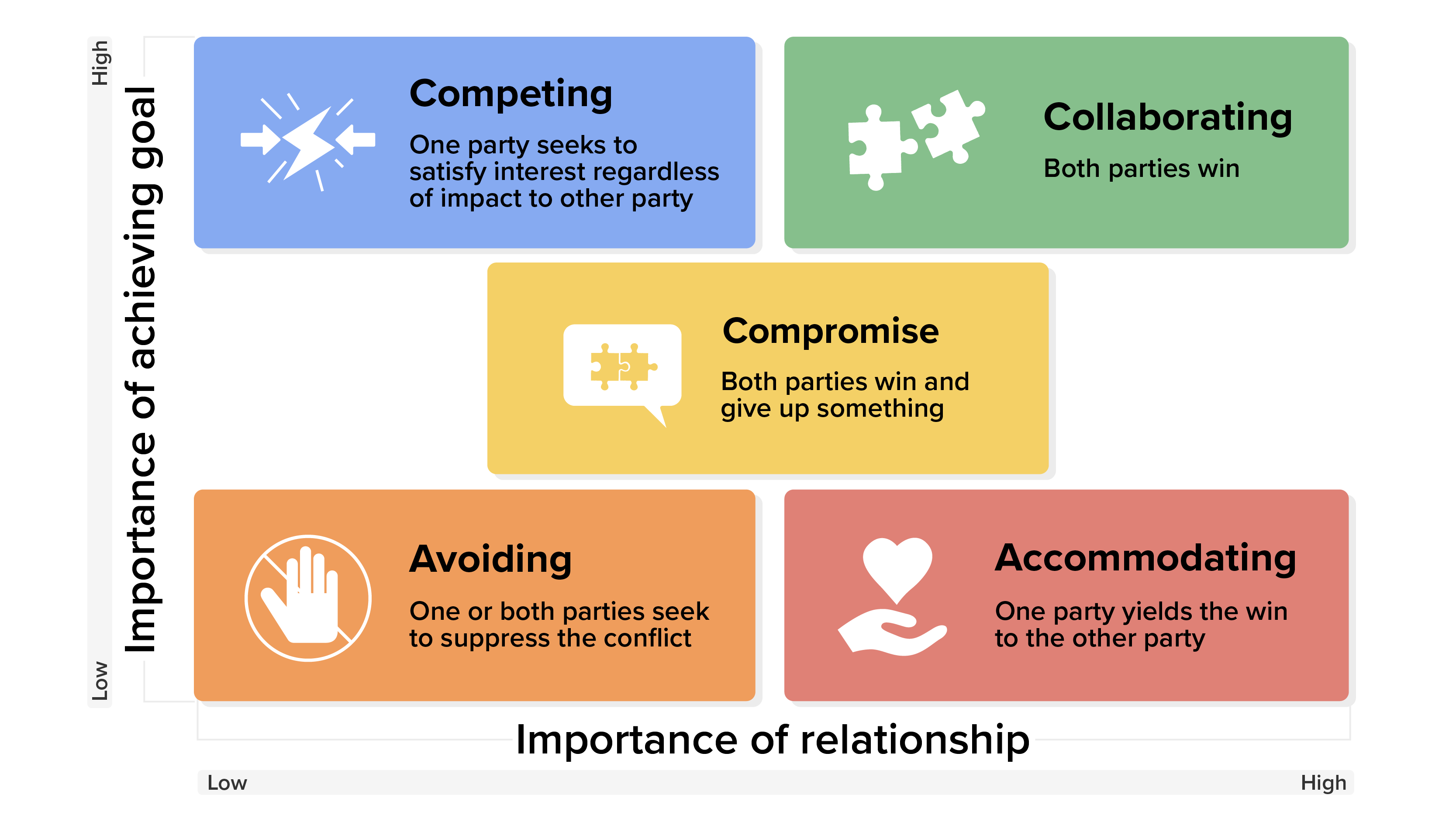 In this chart, the x-axis shows the “importance of relationship” and “cooperativeness.” If the chart is used to analyze a specific conflict, then the x-axis refers to how much the parties value their relationship.