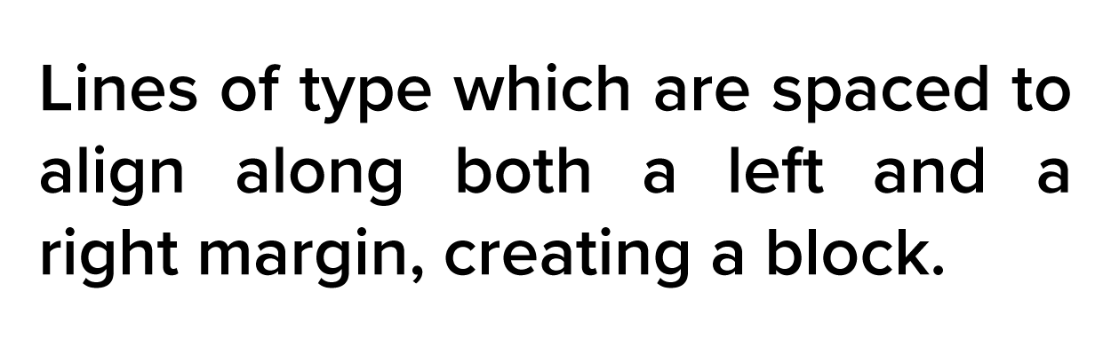 Justified alignment makes the block of text appear more square or rectangular by spacing words out evenly to align with both the left and right margin.