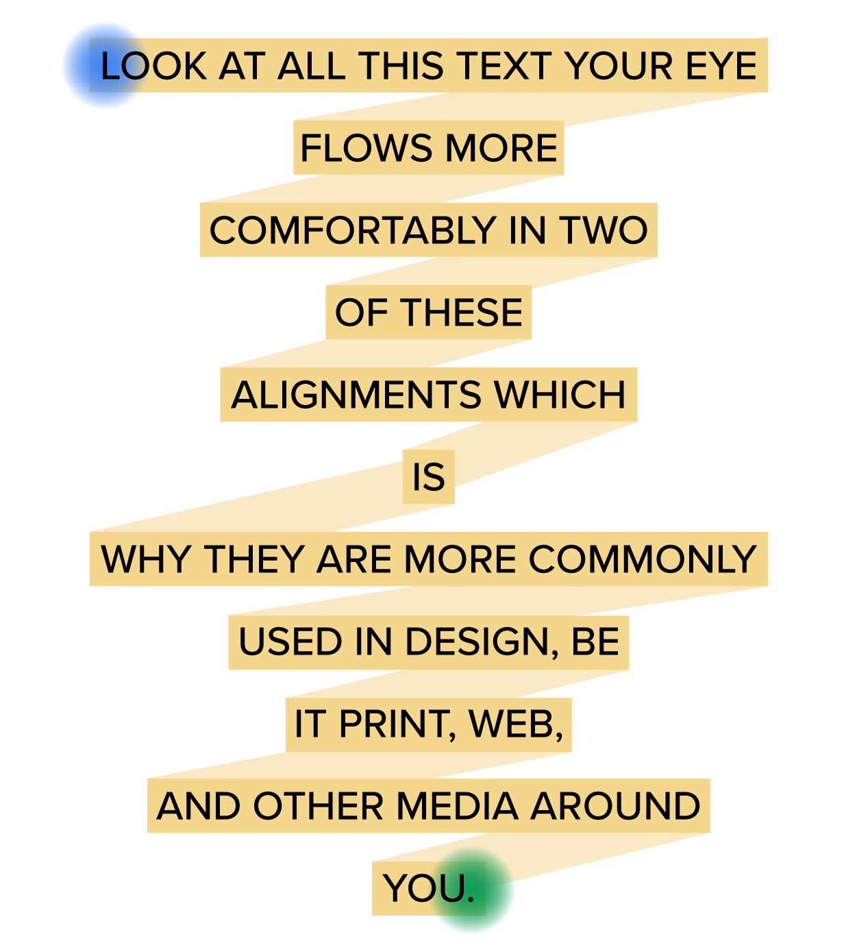 Take a look at the following images of eye flow. The yellow highlight represents your eye flow; the blue dot is the starting point, and the green is the ending point. Look at each image as a whole unit so you can see the paragraph shape that starts to develop as your eye scans the page.