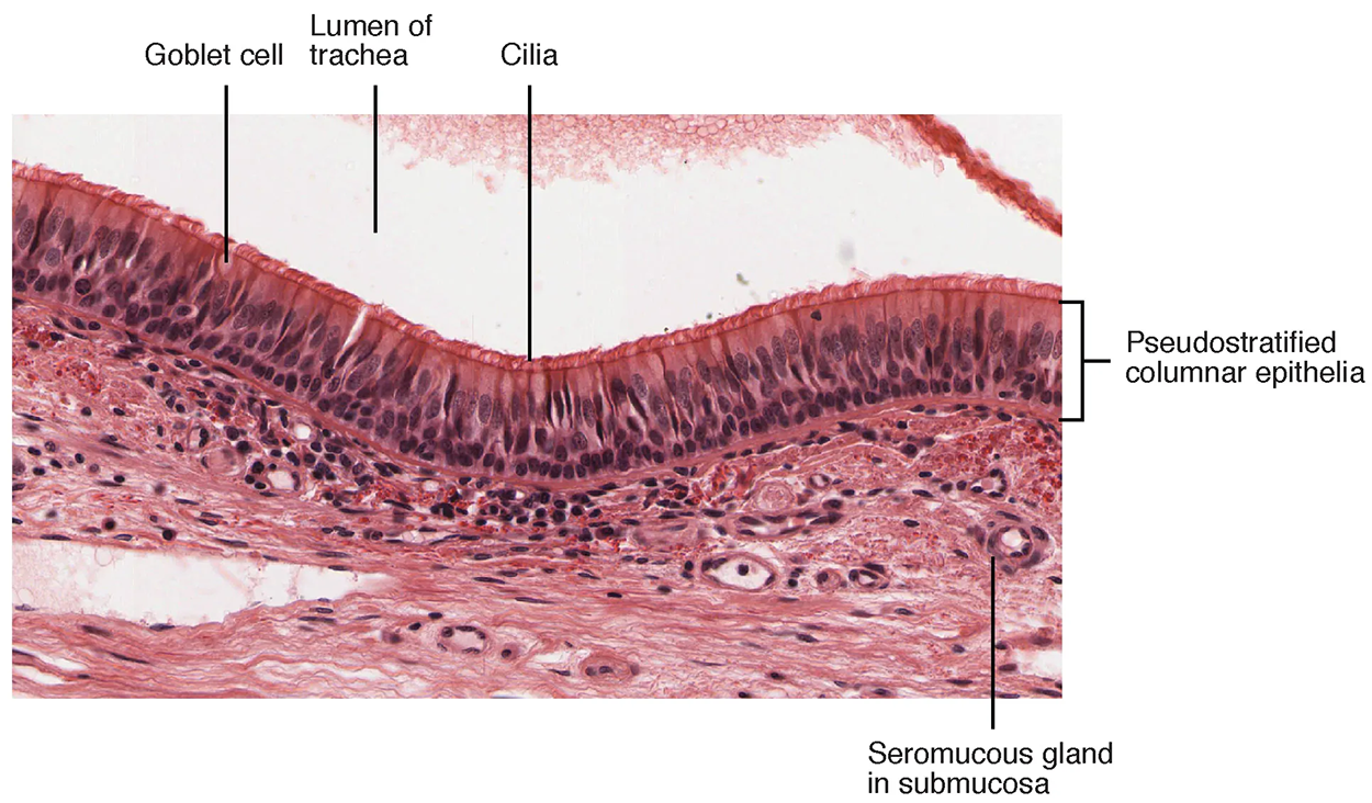 Continuous with the laryngopharynx, the superior (upper) portion of the larynx is lined with stratified squamous epithelium, transitioning into pseudostratified ciliated columnar epithelium that contains goblet cells. Similar to the nasal cavity and nasopharynx, this specialized epithelium produces mucus to trap debris and pathogens as they enter the trachea. The cilia beat the mucus upward towards the laryngopharynx, where it can be swallowed down the esophagus.