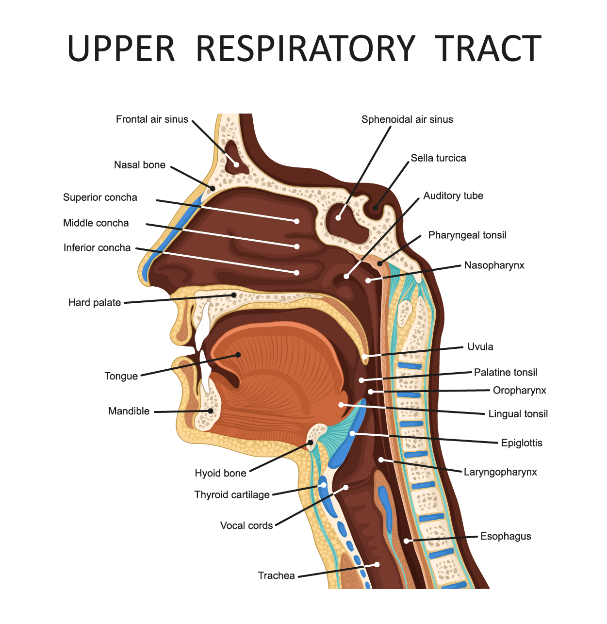 The organs of the upper respiratory tract include the nose and its adjacent structures as well as the pharynx and larynx. The primary roles of the upper respiratory tract include the passing of air breathed in and out of the lungs as well as heating, humidifying, and filtering the air. Moreover, it is involved in actions such as swallowing, speech, and sneezing.