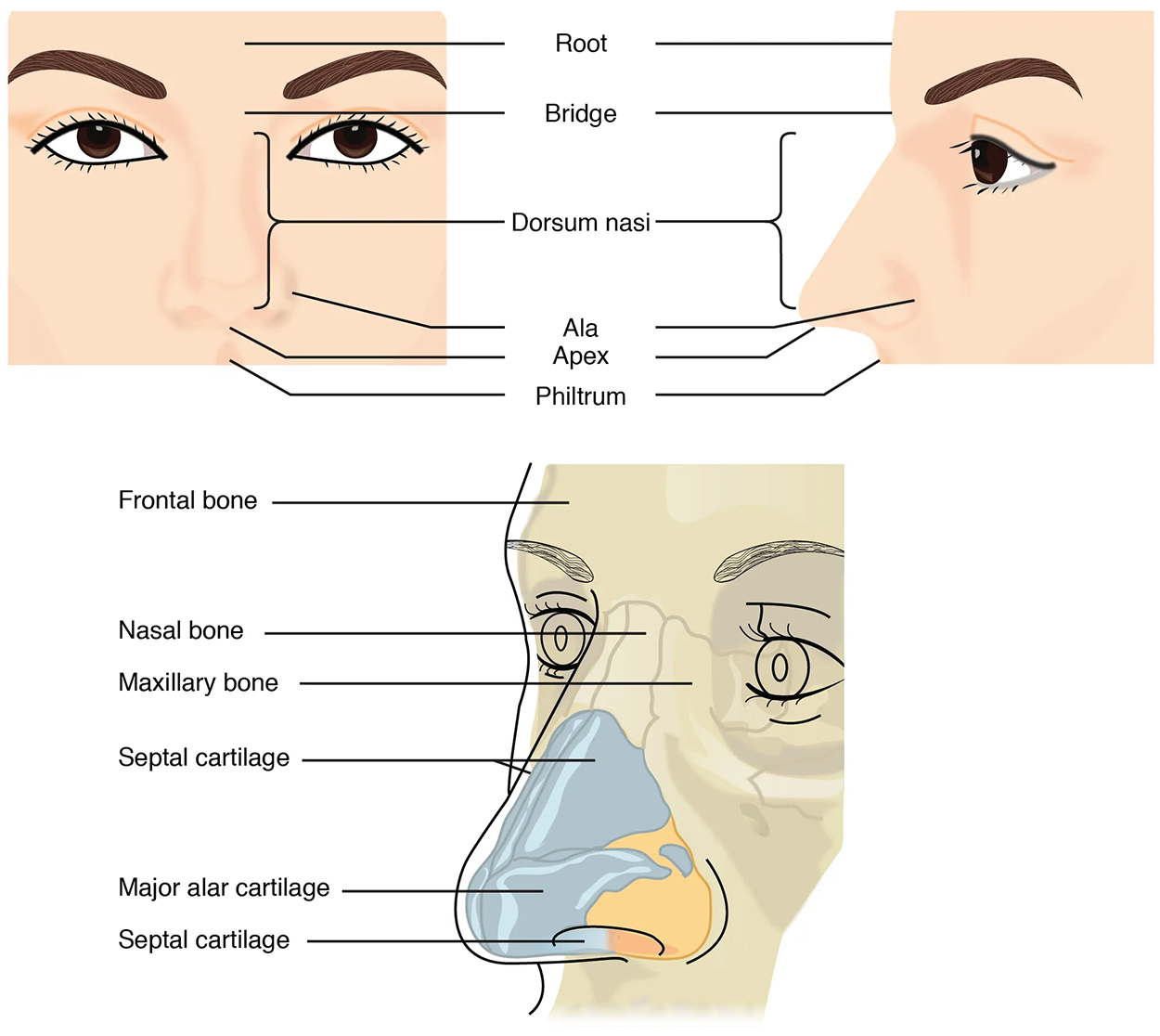 Nose—This illustration shows features of the external nose (top) and skeletal features of the nose (bottom).