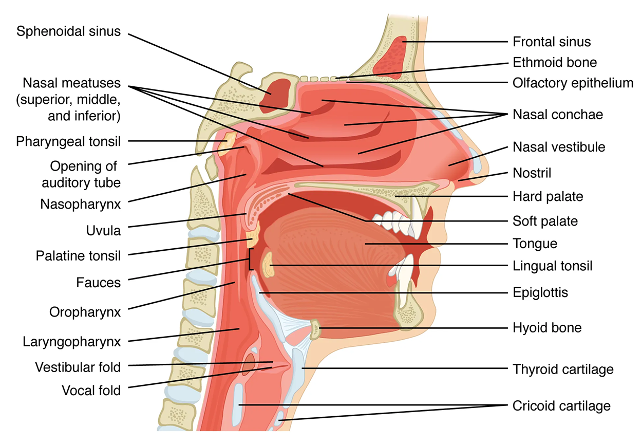 In this lesson, you learned about the structures of the upper respiratory tract. You explored the nose and its adjacent structures and the pharynx, and how they are involved in processes such as passing air in and out of the lungs; heating, humidifying, and filtering air; and swallowing. Then, you examined the structure of the larynx and its role in passing air through the respiratory tract and producing speech.