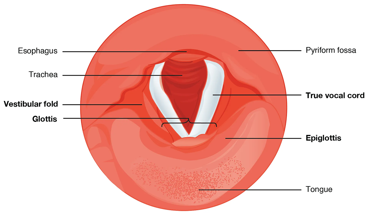 Vocal Cords—The true vocal cords and vestibular folds of the larynx are viewed inferiorly from the laryngopharynx.