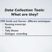 Let's start by talking about data collection tools. In 1995, different data collection techniques were identified by Smith and Garner. These tools help coaches provide feedback after the observation. These tools include things like running transcript, grids, tally sheets, and dialogue recording. We're going to go through each of these and I'll give you some examples.