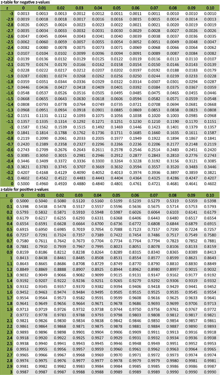 The values for both z-tables correspond with the same information that is illustrated in a z-distribution graph but actually say more about the specific likelihood of an event occurring.