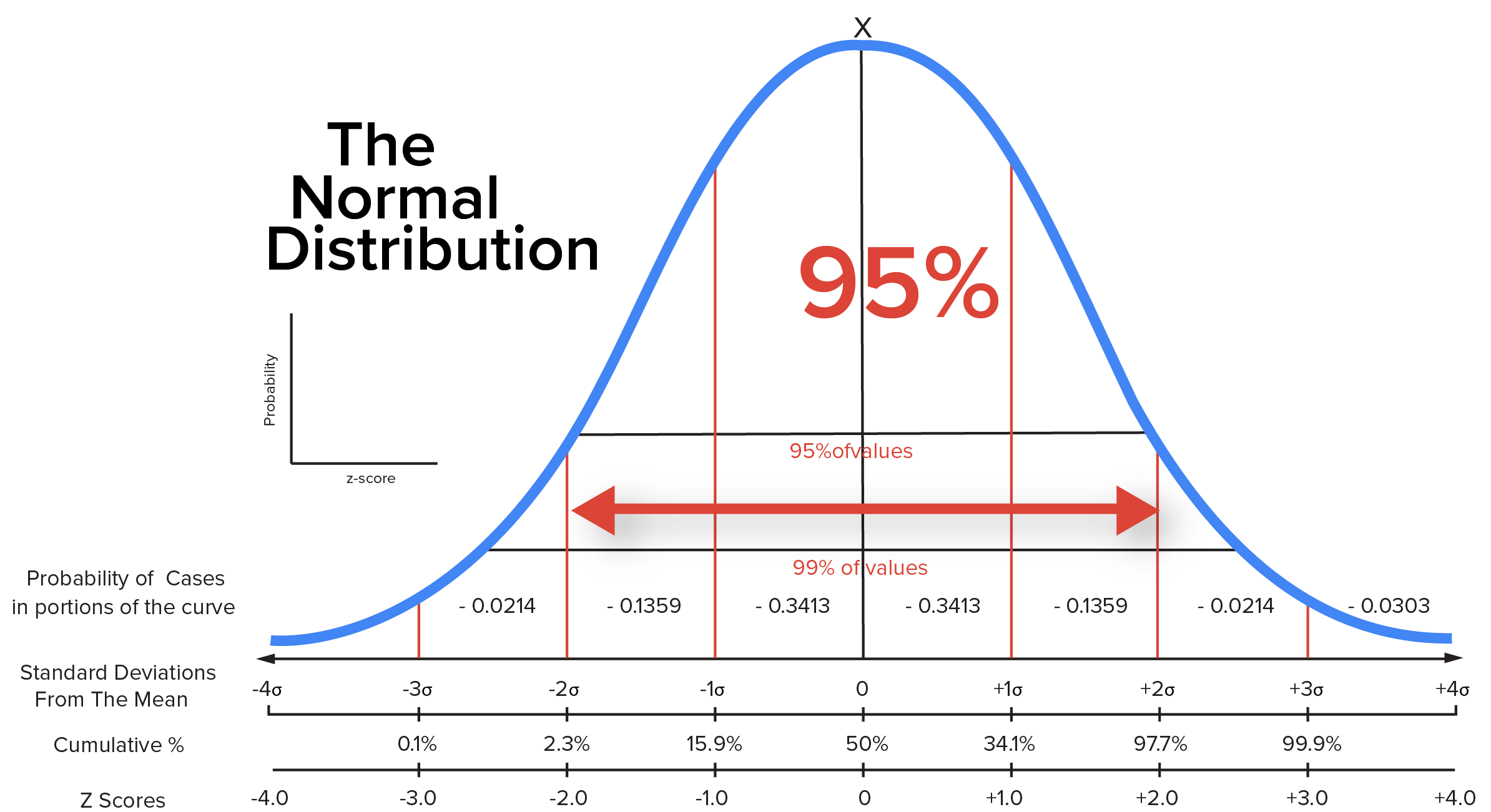 Approximately 68% of values in a normally distributed variable fall between a z-score of -1 and 1. Ninety-five percent of values fall between a value of -2 and 2; 99.7% of values fall between a z-score of -3 and 3. If you were to think of likely values in a normal distribution, they would fall in the 95% between a z-score of -2 and 2.