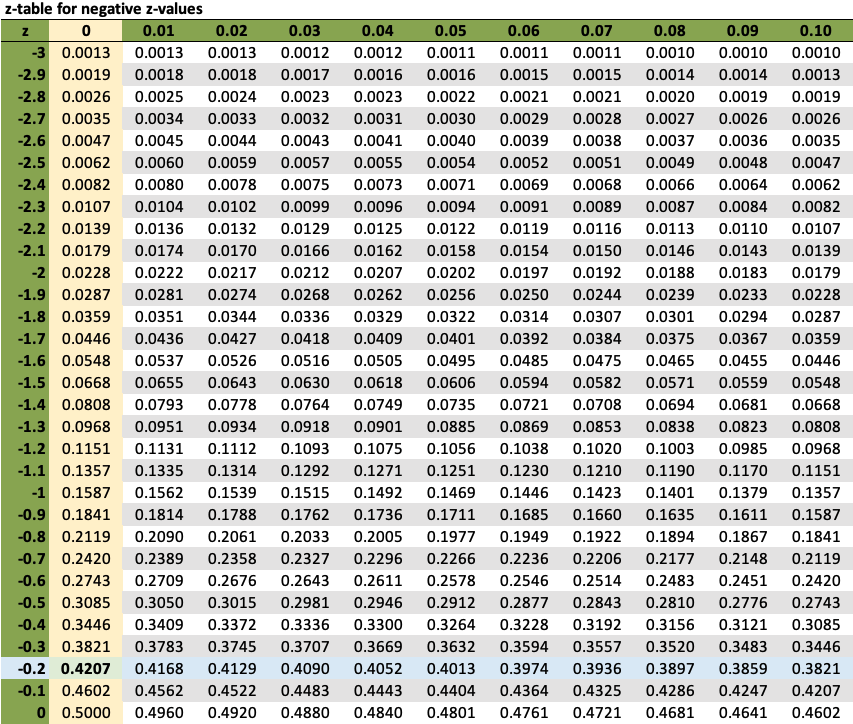 Notice the organization of the z-tables below. The negative z-table starts out at the left of the distribution (-3) and shows increasing values of z up to the point of z being equal to 0. The positive z-table begins at the center of the z-distribution, where z is equal to 0 and represents the mean of the distribution.