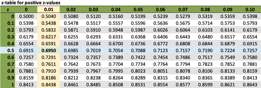 Suppose that you have a probability of 69.5%. Once again, divide this value by 100 to arrive at a probability of 0.695, and scan the z-table to find that 0.695 value. It turns out that the z-value is equal to 0.51.