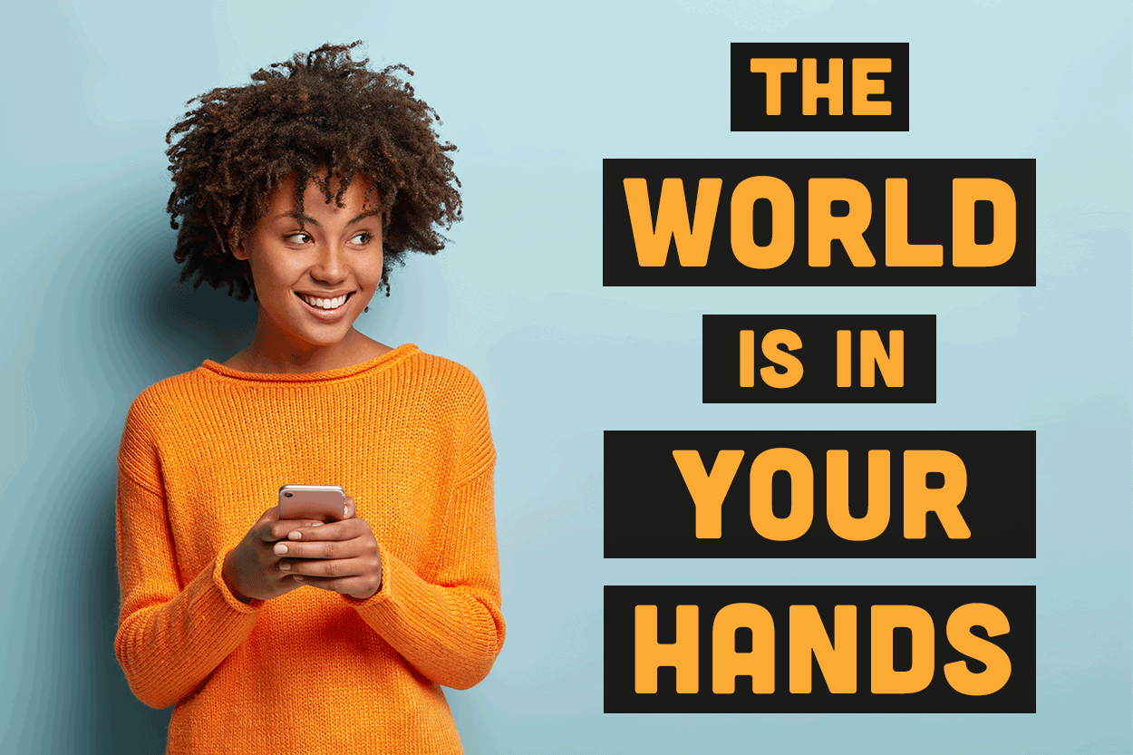 A design for a new smartphone features a young woman holding a device. She smiles and looks in the direction of a large arrangement of text. The design uses a clearly defined color rhythm of blue and orange and easy-to-read typography. The overall design conveys a sense of levity. The design doesn’t trigger a strong response when you look at it, but the woman’s smile, light colors, and font choices imply a feeling of comfort and casual familiarity, eliciting a passive emotional response in the viewer.