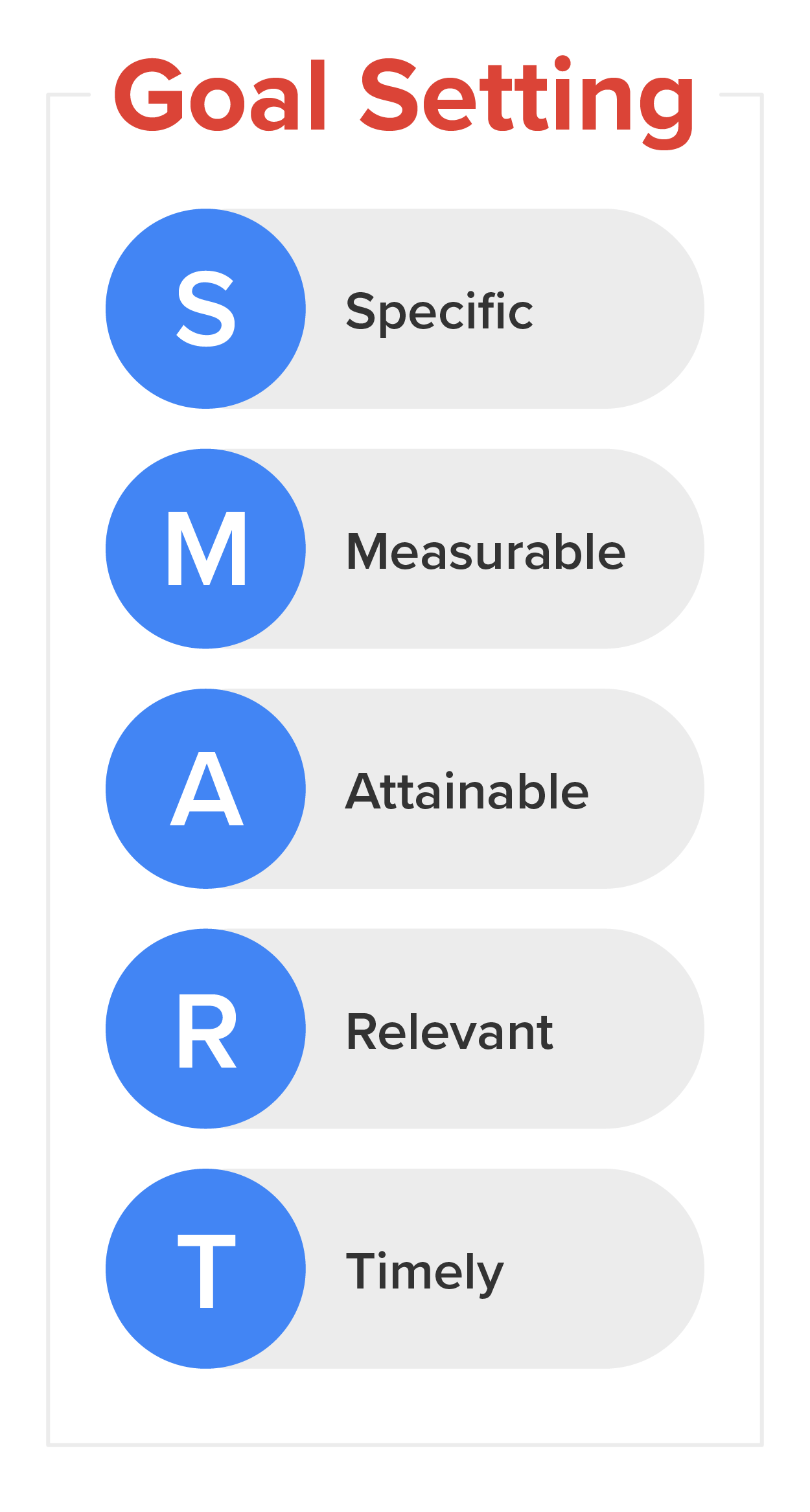 A goal that is Timely, or Time-oriented, has a target date or deadline by which the goal needs to be met. This will keep you on track and motivated to reach the goal while also evaluating your progress. The foundation for large-scale goals is based on small, consistent behaviors or habits. When considering the Timely aspects of goals, habits can take some time to change. A goal where the deadline is just a few weeks away may not truly cement lasting habit formation. However, a goal where the deadline is years away can seem so far in the future that it’s easy to lose interest. A 3–6-month target date often works well as a happy medium.