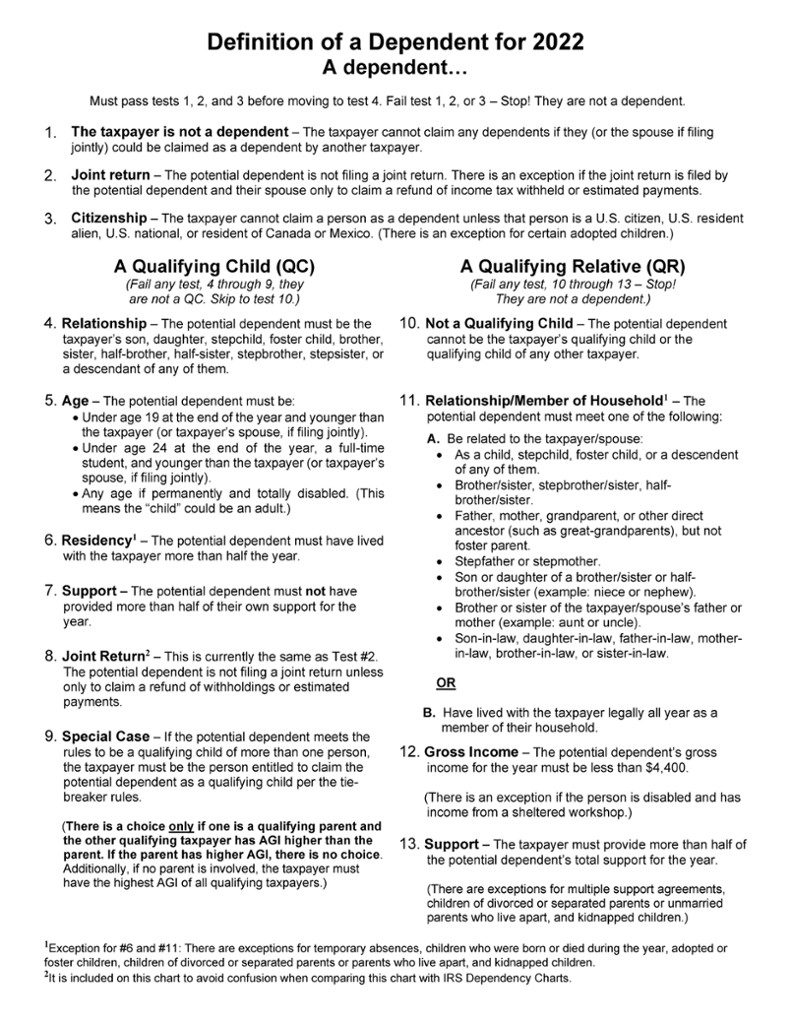 This Definition of a Dependent chart can be used to guide you through the dependency requirements. It is numbered in the order the requirements must be met.
