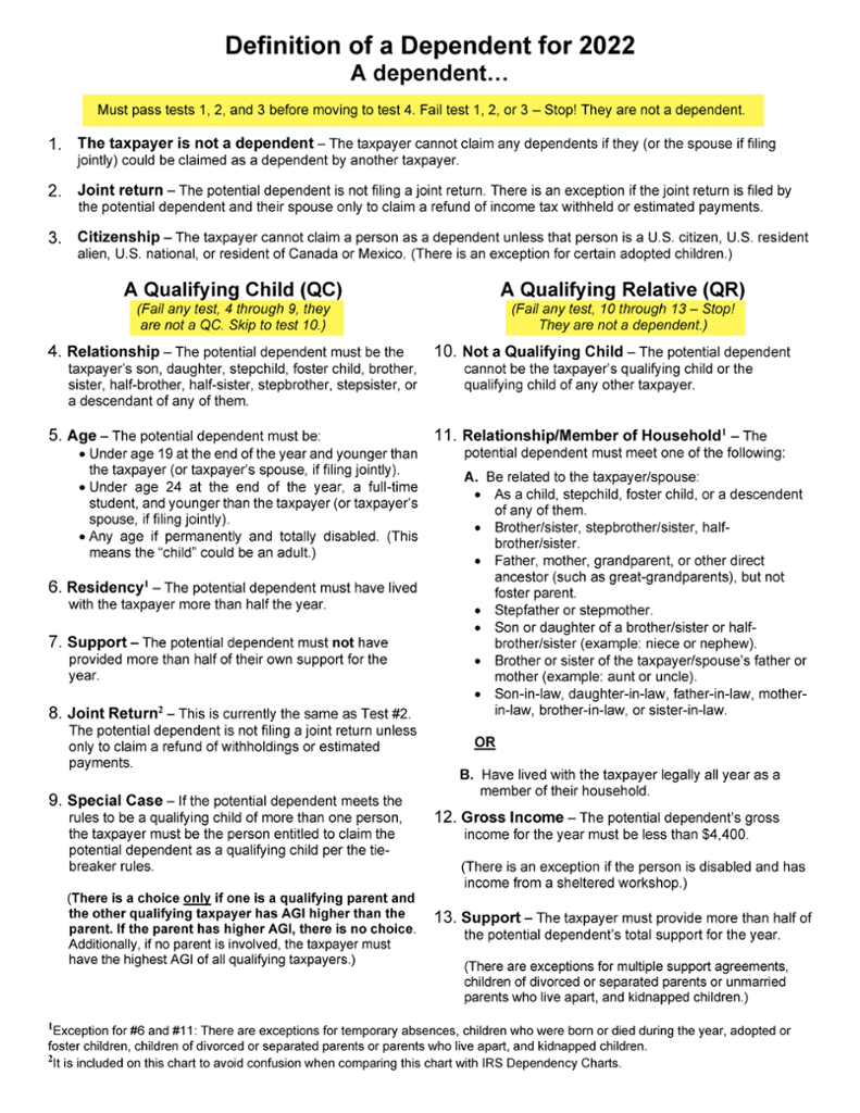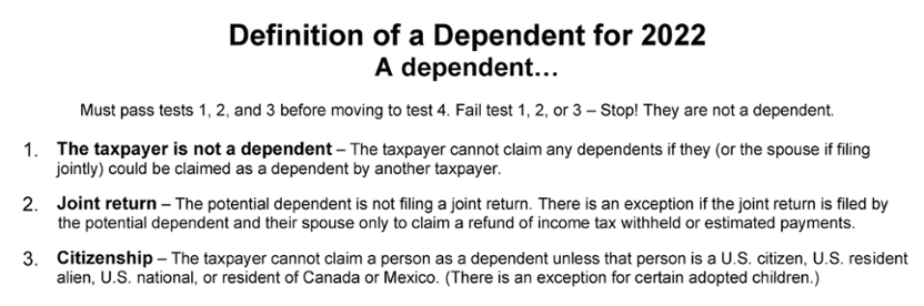 For each potential dependent (person), you will consider the first requirement at the top. If any of the first three requirements are not met, you do not have to go any further. The “potential dependent” is not a dependent.