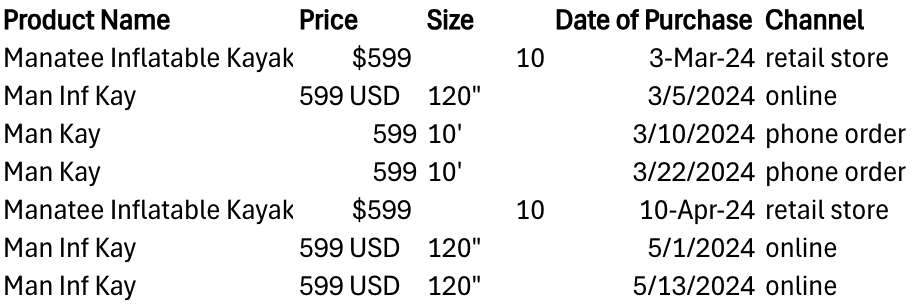 A retail company that specializes in high-quality clothing and outdoor recreational equipment collects data from three different channels: online store, physical retail stores, and phone orders. Each channel records data differently—some use abbreviations, others spell out product names completely.