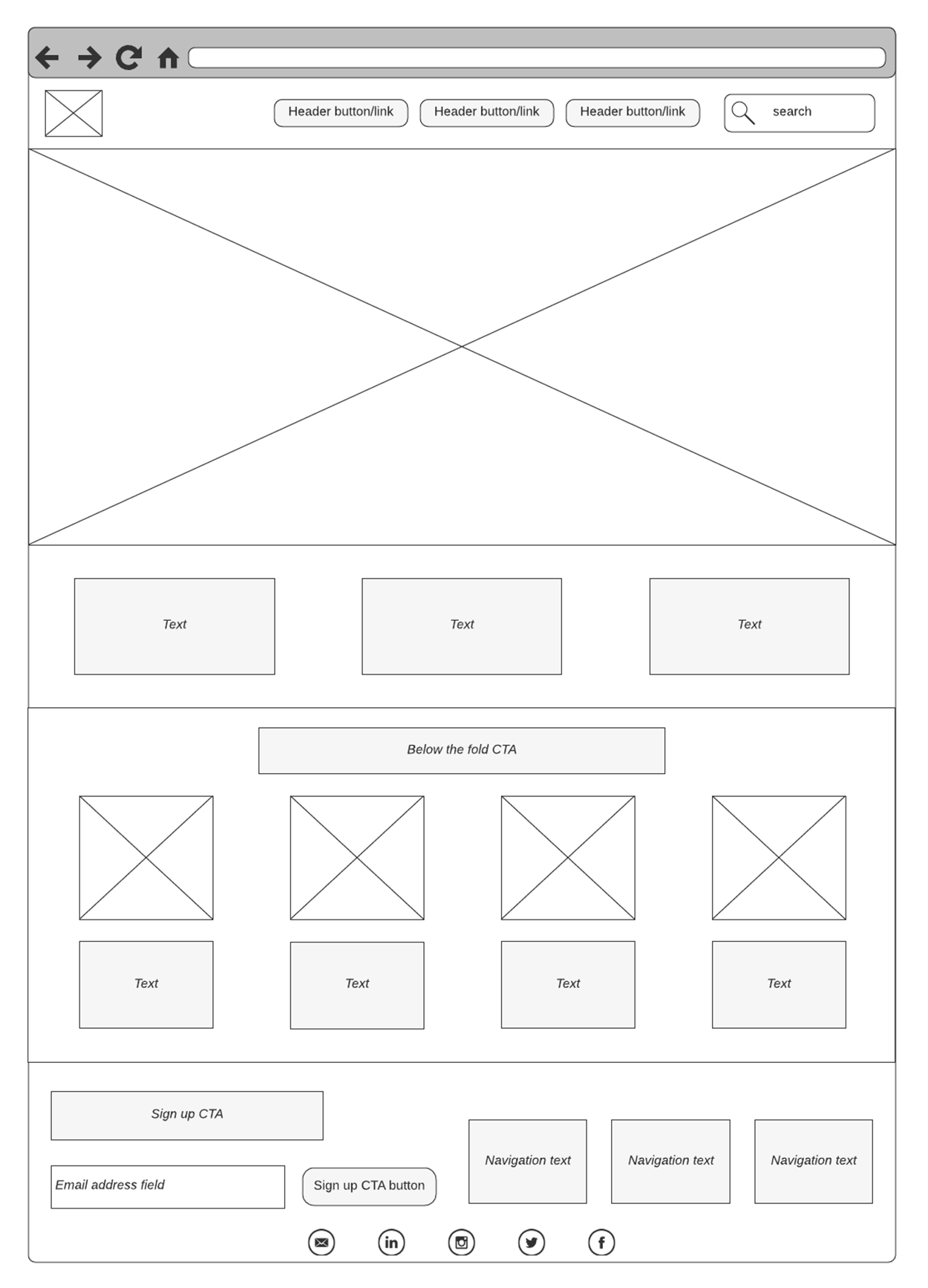 As a beginner in web design, it can be difficult to know what exactly should go into your wireframe. The good news is that you don’t have to guess as most websites use similar layout elements and building blocks. These elements can be organized into categories that reflect their role in the layout. You may not need every item listed below in your wireframe, but by learning these patterns now, you'll be more confident in your design decisions later. Think of this as your wireframing toolbox; with it, you can choose the right tools depending on what your site needs to do.